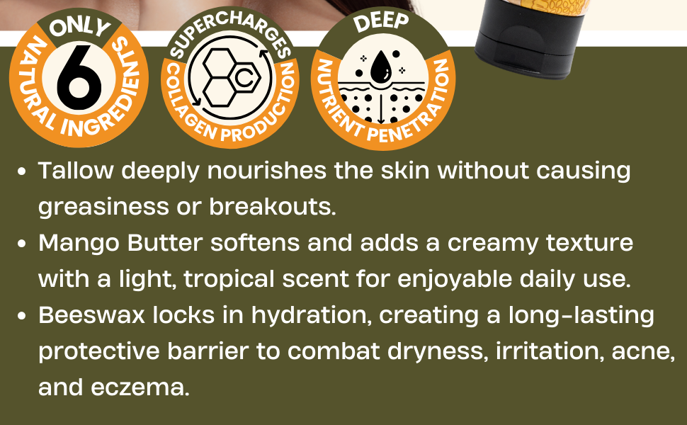 Tallow based formula: Since it's bioidentical to your skin oils, tallow is filled with skin-loving fats(CLAs)and vitamins that perfectly moisturizes your skin